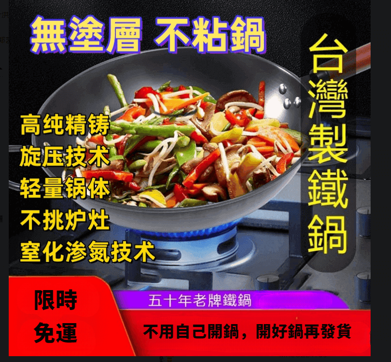 無塗層不粘鐵鍋,手工鍛造,0塗層不粘鍋, 1200℃高溫大火開鍋,氮化處理,不生鏽,重量輕便,更適合女士